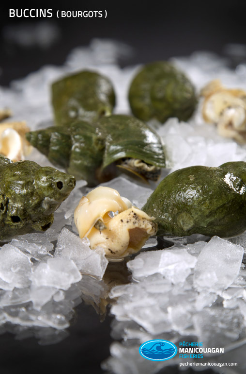 Très abondant dans le fleuve et l’estuaire du St-Laurent, le buccin est un mollusque dont le coquillage est spiralé et dont la chair est de couleur blanc crème tachetée de noir. Également connu sous le nom de « bourgot », on le pêche au casier dans les eaux profondes, du mois d’avril jusqu’au mois de septembre.